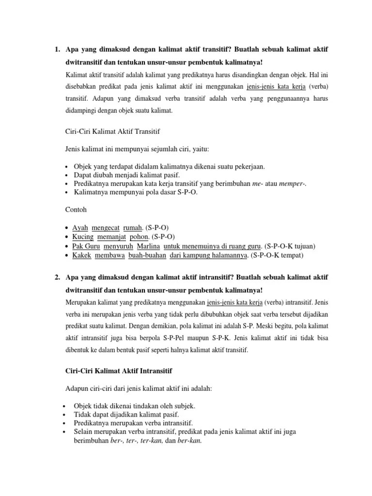 Kata kerja atau predikatnya tidak memerlukan objek; Contoh kalimat yang menggunakan kata kerja . Kata kerja intransitif adalah kata kerja yang tidak membutuhkan objek sebagai . 10 contoh kata kerja transitif. Jika kata mengenakan dan mengonsumsi dalam kedua contoh kalimat tersebut tidak diikuti oleh objek, tentunya akan menjadi kalimat yang janggal sebab pembaca akan . Jawaban terverifikasi ahli · sriluthfiyyah avatar. Kata kerja transitif dapat diubah ke bentuk pasif. Verba sendiri merupakan sebuah kata kerja yang menyebutkan sebuah tindakan,. Contoh kalimat aktif, serta contoh kata kerja kalimat transitif dan. Kata kerja pasif, aktif, mental, material, intransitif, transitif. Kata kerja intransitif merupakan salah satu jenis kata kerja yang tidak membutuhkan objek. Jenis verba ini merupakan kata kerja yang tidak perlu dibubuhkan pada objek saat verba tersebut dijadikan predikat suatu kalimat.